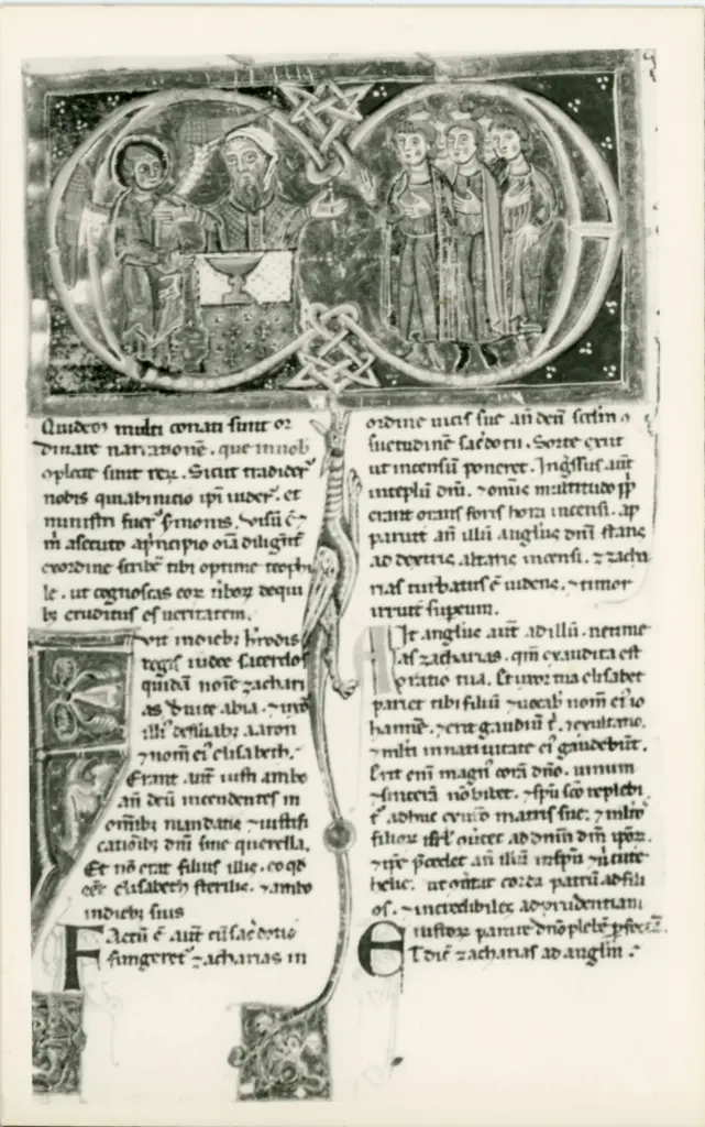 Iniziale Q, Iniziale istoriata, Iniziale F, Iniziale decorata, Motivi decorativi fitomorfi, Annuncio a san Zaccaria